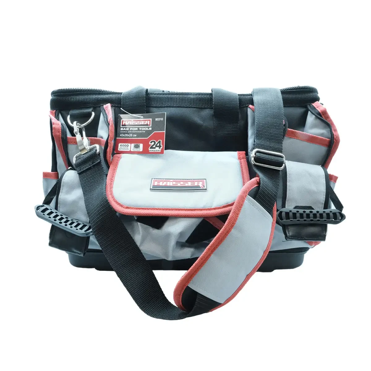 Сумка для інструментів 24 кишені 43х26х28см Haisser 90310 - виготовлена з міцного матеріалу, що забезпечує тривалий термін служби. Призначена для транспортування інструментів. М'яка ручка для зручного перенесення. Колір чорний, сірий із червоними вставками з написом Haisser.